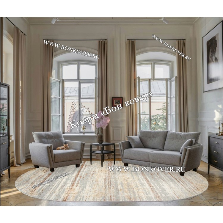 Изящный Ковер в гостиную дизайн 29651 Овал наполняет интерьер жилого пространства теплом и уютом, гармонично сочетает в себе изящество и красоту. Он выполнен из износостойких материалов, комфортный и долговечный.